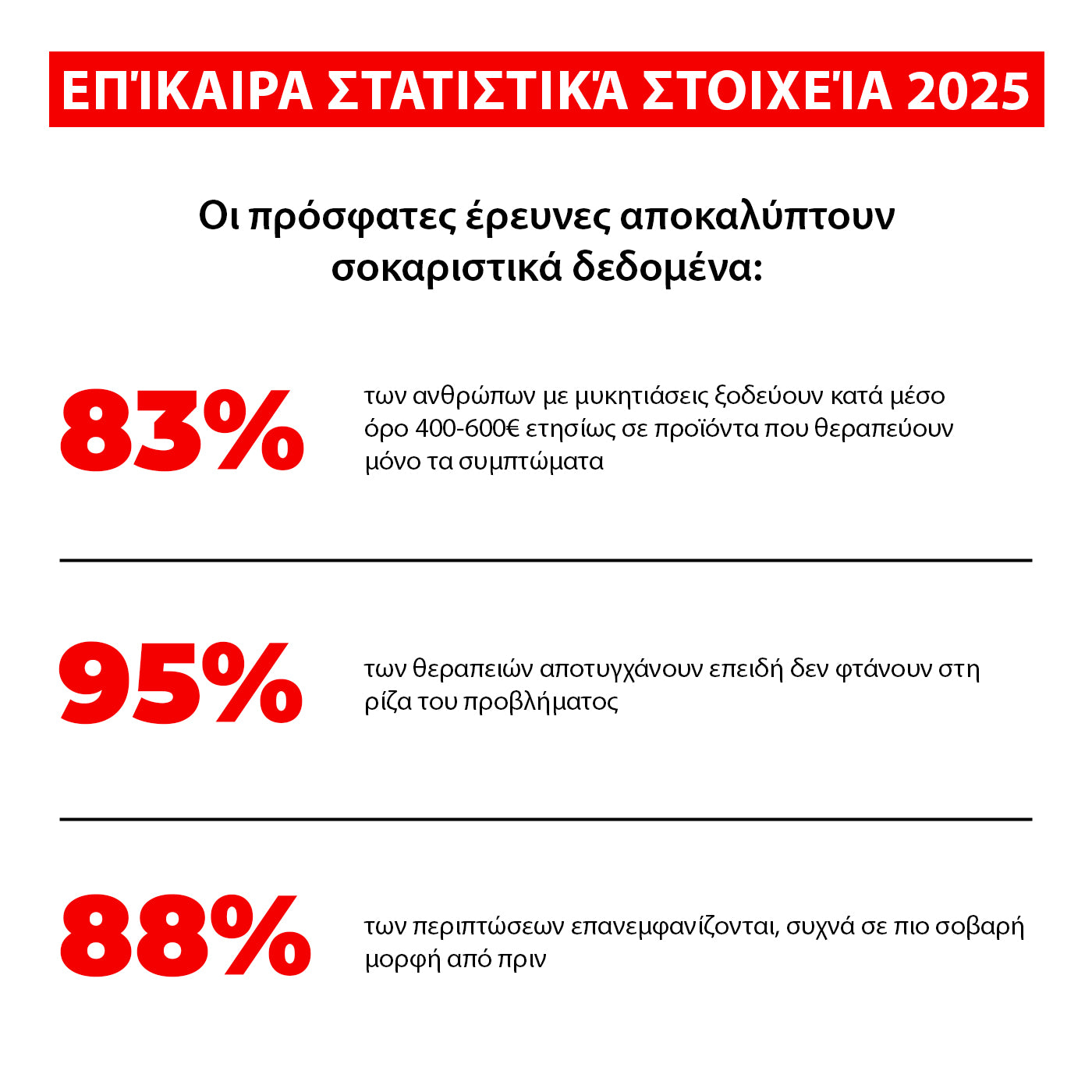 Το 83% των ατόμων με μύκητες ξοδεύουν κατά μέσο όρο 400-600 BGN ετησίως σε προϊόντα που αντιμετωπίζουν μόνο συμπτώματα. Το 95% των θεραπειών αποτυγχάνουν επειδή δεν φτάνουν στη ρίζα του προβλήματος. Το 88% των περιπτώσεων επανεμφανίζονται ξανά, συχνά πιο σοβαρά από πριν.